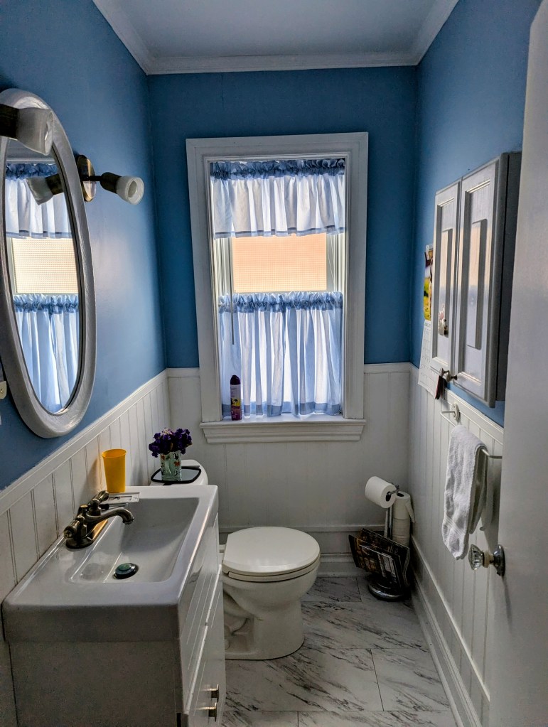 As for my Mom and I, this past week was fairly quiet. We made a few trips to London and Ingersoll to get supplies. As some of you might have noticed from my Facebook page, my Mom took on another “home fix-em-up project,” as my Dad used to say. She painted the main floor bathroom. I would like it noted that I helped pick out the colour, which we both think looks good. But I must give credit where credit is due, my Mom stripped all the wallpaper off, did all the painting and also made the curtains. The biggest issue, post-project, is that she still has almost a full can of blue paint and she’s not sure what to do next.
