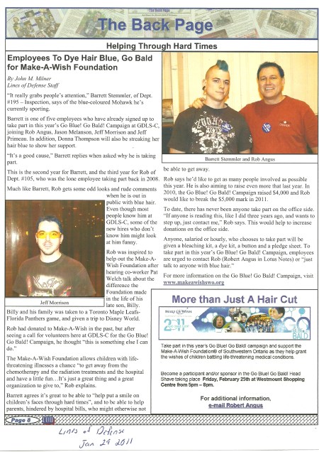 Helping Through Hard Times/Employees To Dye Blue, Go Bald for Make-A-Wish Foundation – General Dynamics Land Systems-Canada Lines of Defence, January 24, 2011